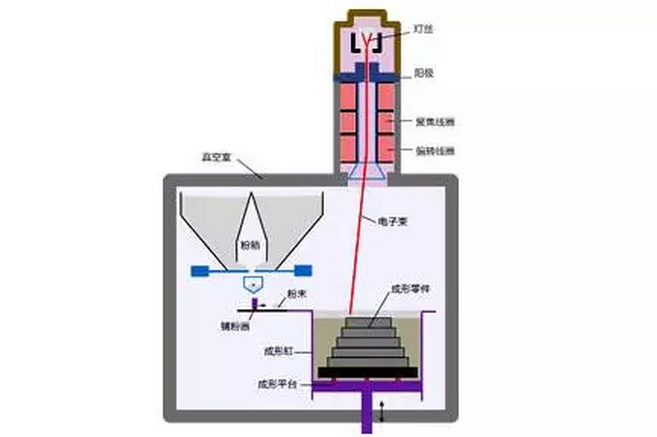 電子束選區(qū)熔化技術(shù)(Electron Beam Selective Melting,EBSM)的原理與SLM類似,只不過EBSM是在真空環(huán)境中,以電子束作為輸出熱源。相比激光,電子束更容易獲得,可以相應(yīng)的降低部分加工成本,同時真空的工作環(huán)境也可以有效保證鈦合金和鋁合金在內(nèi)的很多活潑金屬在加熱過程中不易被氧化。