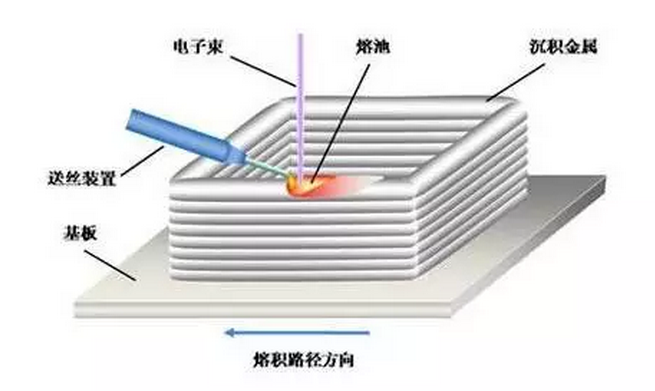 電子束熔絲沉積技術(shù)(ElectronBeamFreeformFabrication,EBFF),是電子束焊接技術(shù)(EBM)和快速成形思想結(jié)合的產(chǎn)物。在真空環(huán)境中,高能量密度的電子束轟擊金屬表面,在前一沉積層或基材上形成熔池,金屬絲材受電子束加熱融化形成熔滴。隨著工作臺的移動,使熔滴沿著一定的路徑逐滴沉積進入熔池,熔滴之間緊密相連,從而形成新的沉積層,層層堆積,直至制造出金屬零件或毛坯。