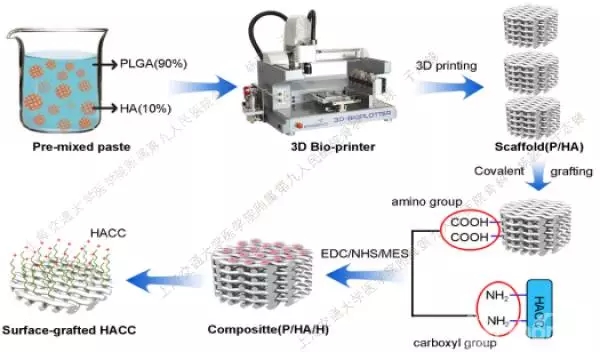在骨科臨床上,大段的骨缺損常伴有傷口的污染或開(kāi)放,存在較高的感染風(fēng)險(xiǎn)。植入的材料在某種程度上也創(chuàng)造了細(xì)菌粘附生長(zhǎng)的載體或微環(huán)境,細(xì)菌可在其表面形成生物膜,而生物膜的形成是感染發(fā)生的關(guān)鍵環(huán)節(jié)。近期,上海交通大學(xué)醫(yī)學(xué)院附屬第九人民醫(yī)院骨科湯亭亭教授團(tuán)隊(duì)利用3D打印方法,制備了聚乳酸-羥基乙酸共聚物/羥基磷灰石(PLGA/HA)復(fù)合多孔生物支架并表面接枝殼聚糖季銨鹽(HACC);體內(nèi)外研究表明,該人工骨組織修復(fù)支架不僅具有很好的成骨能力,還兼具良好的抗菌活性。由于目前大多數(shù)骨缺損修復(fù)材料或技術(shù)都只著眼于無(wú)菌環(huán)境下的骨修復(fù);此種兼具抗菌性能的人工骨組織替代材料,對(duì)臨床上高感染風(fēng)險(xiǎn)或已感染骨缺損的防治具有重要應(yīng)用價(jià)值。