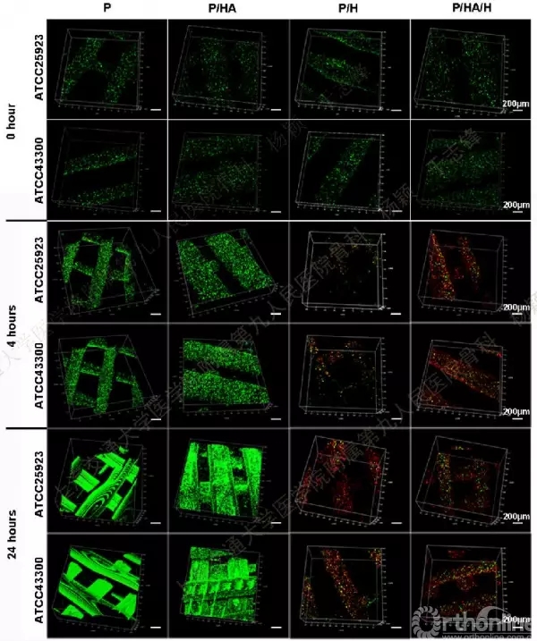 Fig.3. Three-dimensional images of bacterial viability on the surfaces of various scaffolds at 4 h and 24 h obtained using confocal laser scanning microscopy (CLSM) after the scaffolds were stained with the BacLight dead/live stain.
