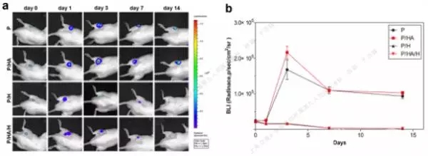 Fig.5. Real-time monitoring of bacterial photon intensity detection from metabolically active S.aureus Xen29 in the subcutaneous embedding model. (a) Representative images of in vivo bioluminescence over a period of 14 days using an IVIS camera. (b) Curves of mean bacterial burden.