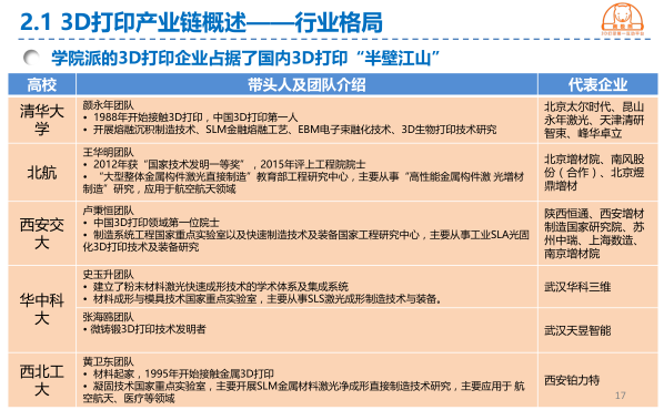 該報告統(tǒng)計了全球當(dāng)前最為先進(jìn)和成熟的8大3D打印技術(shù),并逐一說明其當(dāng)前應(yīng)用情況。中國3D打印此前呈現(xiàn)“清華、交大、華科”三足鼎立的局勢,三大學(xué)院派占據(jù)了中國3D打印幾乎整個江山。然而,隨著行業(yè)的發(fā)展,這一局勢發(fā)生了明顯的變化。