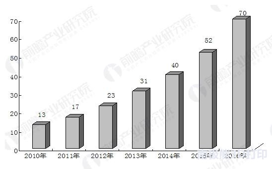 2010-2016年全球3D打印市場(chǎng)規(guī)模趨勢(shì)圖(單位:億美元)