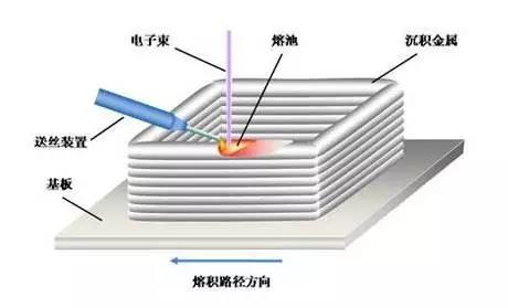 電子束熔絲沉積技術(shù)(ElectronBeamFreeformFabrication,EBFF),是電子束焊接技術(shù)(EBM)和快速成形思想結(jié)合的產(chǎn)物。在真空環(huán)境中,高能量密度的電子束轟擊金屬表面,在前一沉積層或基材上形成熔池,金屬絲材受電子束加熱融化形成熔滴。隨著工作臺的移動,使熔滴沿著一定的路徑逐滴沉積進入熔池,熔滴之間緊密相連,從而形成新的沉積層,層層堆積,直至制造出金屬零件或毛坯。