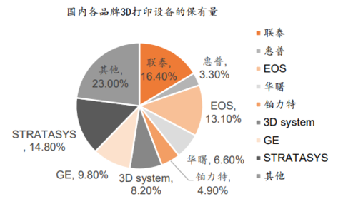 設(shè)備是國(guó)內(nèi)3D打印產(chǎn)業(yè)中產(chǎn)值最大的環(huán)節(jié),目前大約占整個(gè)行業(yè)總產(chǎn)值的40%-50%;從國(guó)內(nèi)的3D打印市場(chǎng)來(lái)看,設(shè)備環(huán)節(jié)的進(jìn)口替代大幕已經(jīng)開(kāi)啟,在存量市場(chǎng)上,聯(lián)泰、鉑力特、華曙等3家企業(yè)的合計(jì)占有率已達(dá)到27.9%(主要是工業(yè)級(jí)3D打印機(jī));