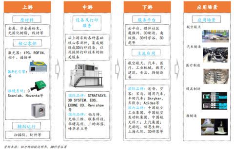 經(jīng)過(guò)30多年的發(fā)展,3D打印行業(yè)已經(jīng)形成一條比較完成的產(chǎn)業(yè)鏈,包括上游的各類原材料、中游的3D打印設(shè)備及服務(wù),航空航天、汽車、醫(yī)療、教育等眾多下游應(yīng)用領(lǐng)域。