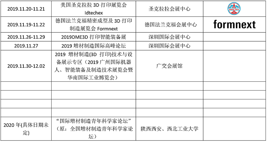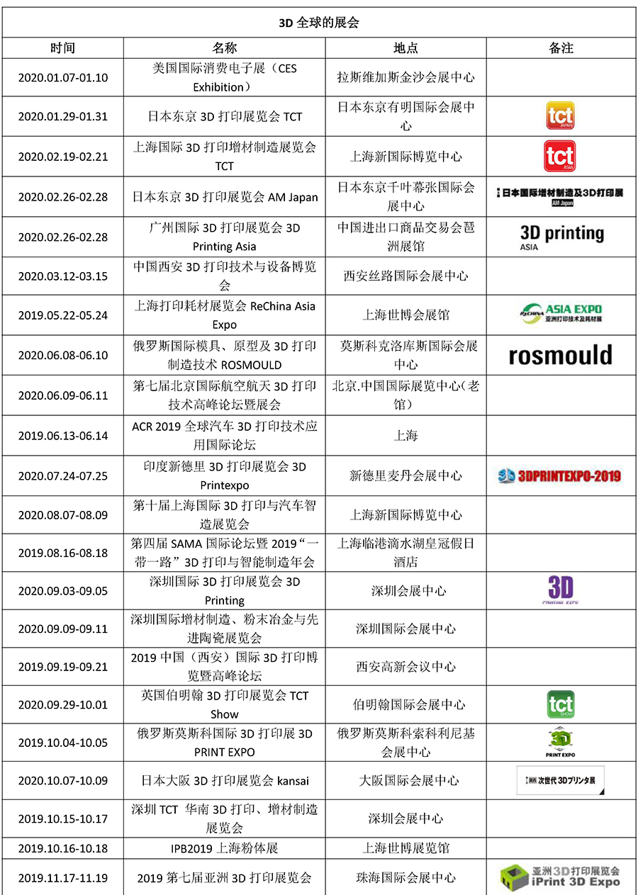 2019-2020 年度國(guó)內(nèi)外3D 打印展會(huì)一覽表